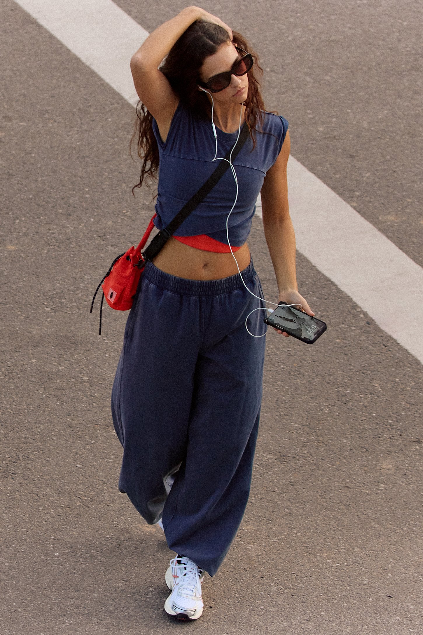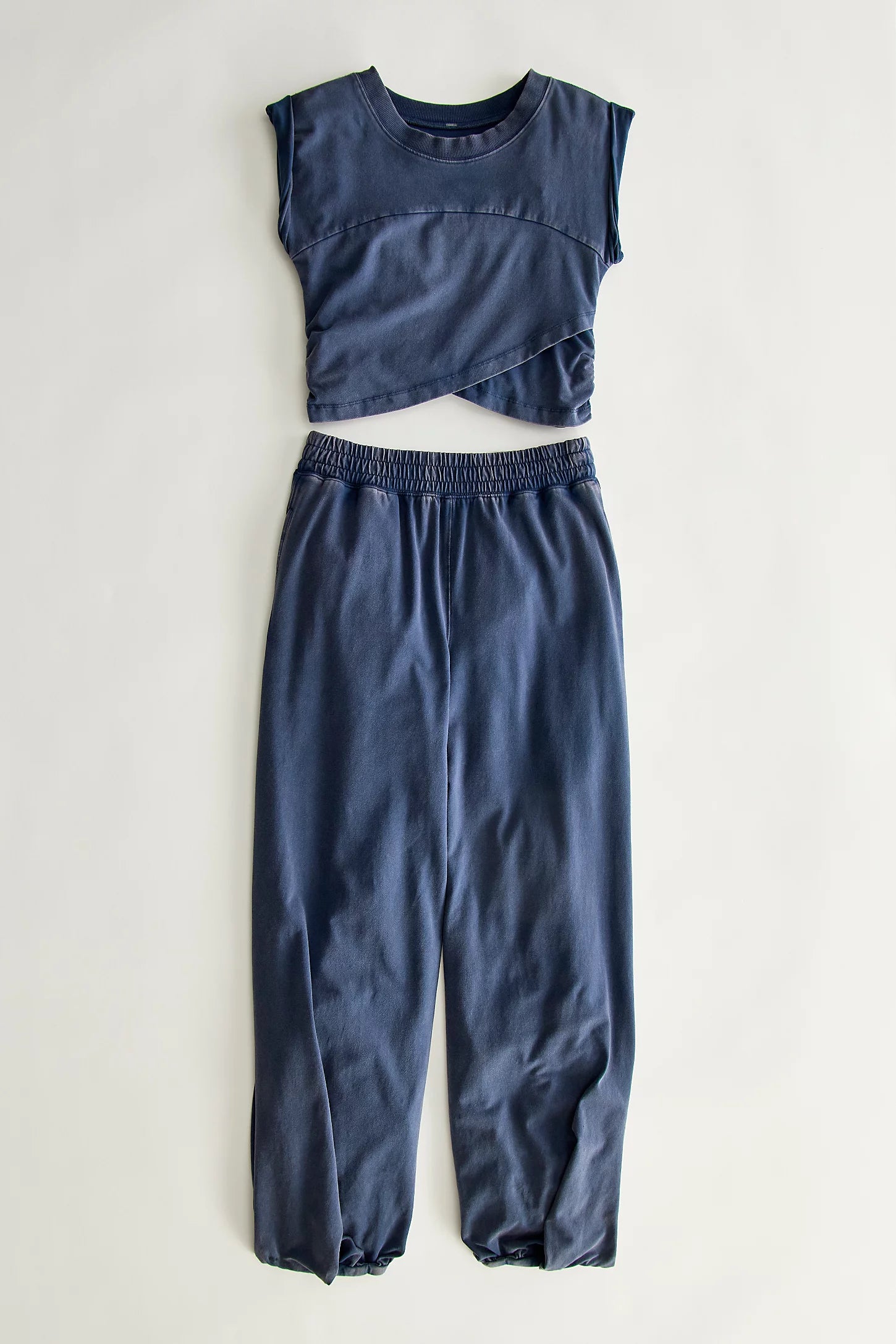 Features: Soft, jersey fabrication; relaxed fit; cropped muscle tee top with seaming detail; ankle length pant with high-rise waist and wide leg; elasticated waistband and cuffs; crossover detail on top; ribbed collar; side seam pockets