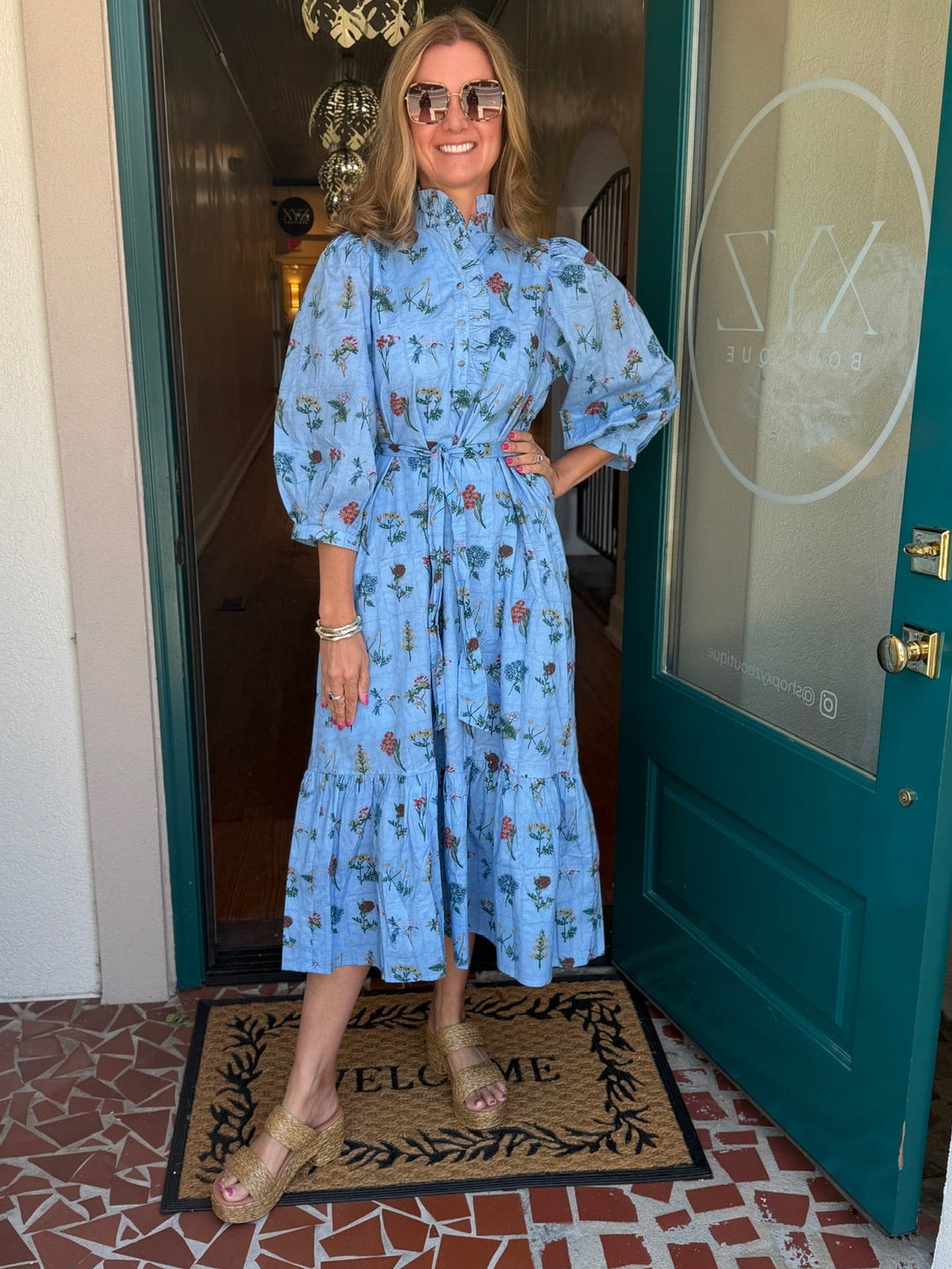 Floral print ruffled neck band collar 3/4 puff sleeve midi dress featuring button closure at front and self-tie waist belt. Ruffle hem. Side pockets. Lined. Woven.