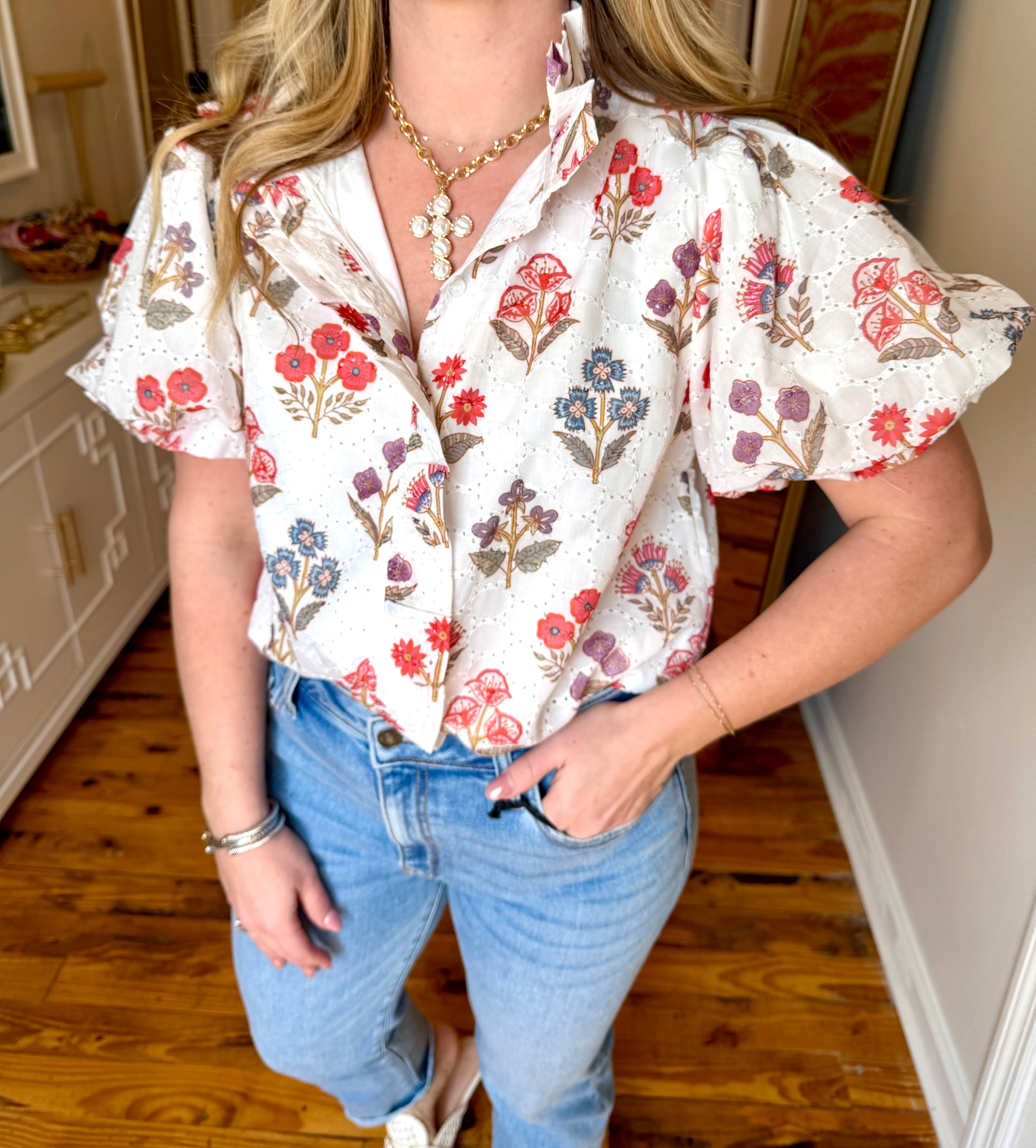 Short puff sleeves button down floral print eyelet top with ruffle detail. Angela in a size small.